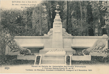 Autre trait de son caractère, son souci des vieux comédiens. C’est pour eux, et en y contribuant financièrement lui-même, qu’il fonda la maison de retraite de Pont-aux-Dames, en Seine et Marne dans laquelle il se réserva une chambre. Cette maison de retraite est toujours activité, même si elle n’est plus réservée aux comédiens, et on peut y voir , quelques tableaux et affiches, dont celle de la création. Surtout, dans le fond du parc, on peut aller saluer celui que Rostand baptisa « Le Coq » après qu’il lui eut donné le rôle de Chantecler. C’est là en effet que Constant Coquelin a choisi d’être inhumé.